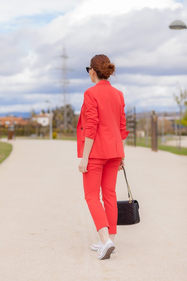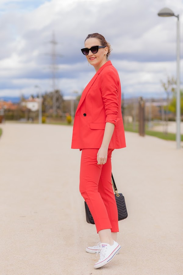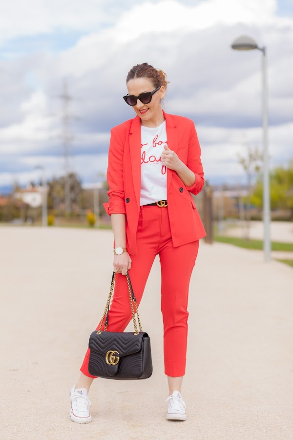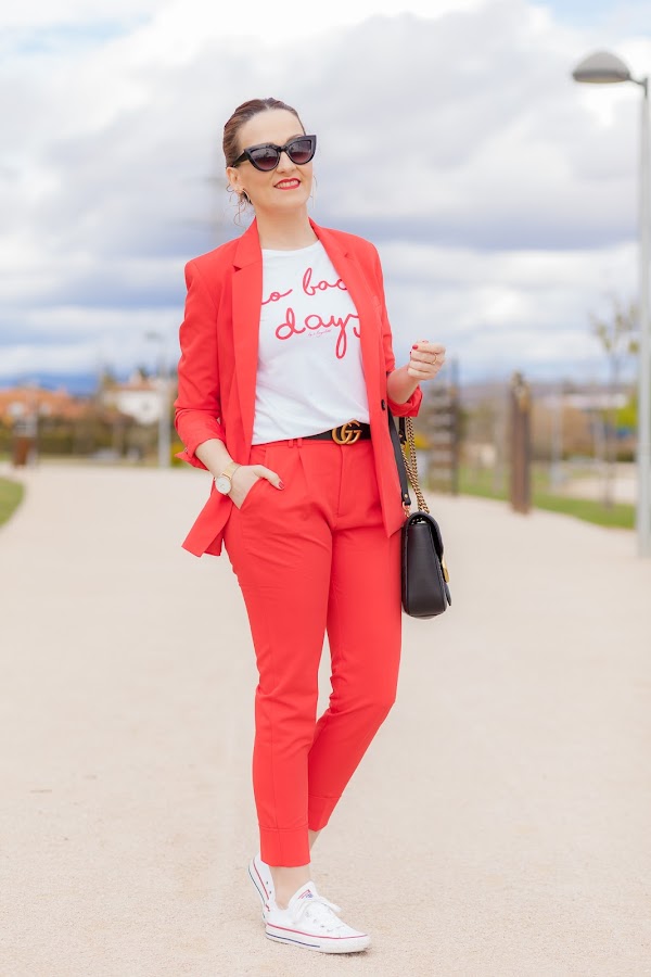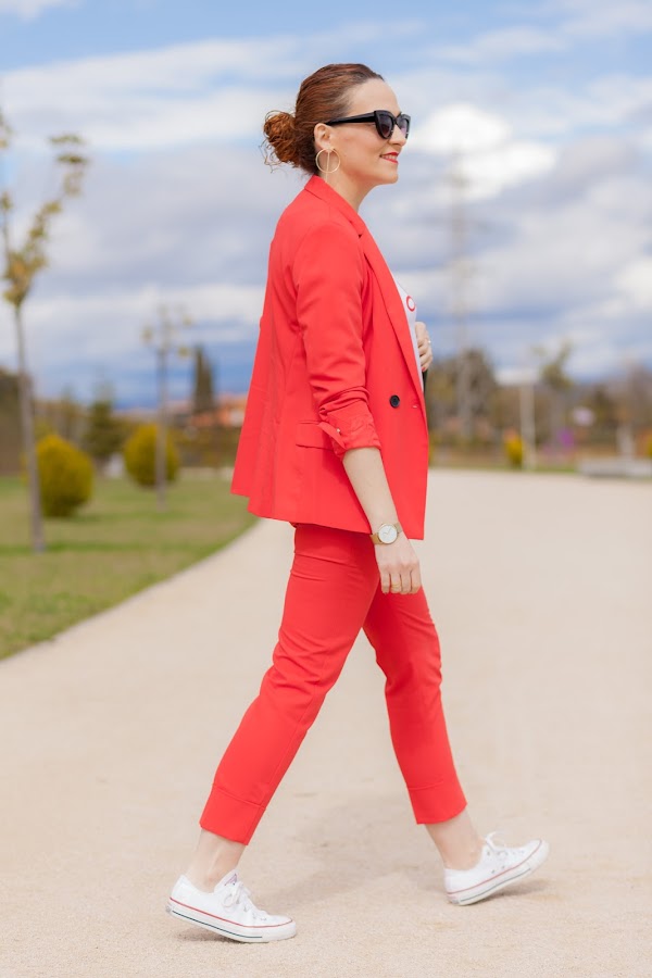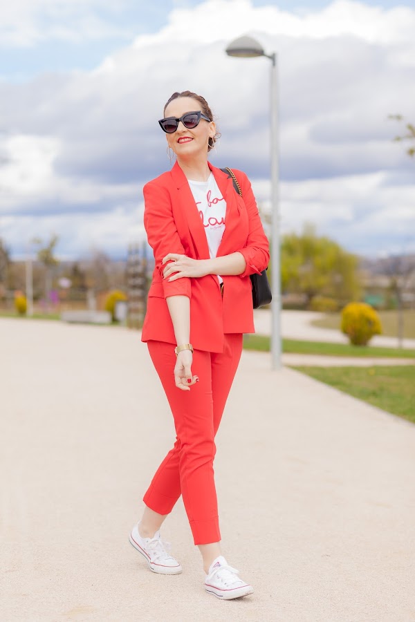 Esta primavera es sin duda la de los trajes. Por ahora los más vistos son los rosas, y sí, yo también he picado en este color que pronto os enseñaré, pero como veís hoy llevo uno en rojo que me flipa y que he combinado con una camiseta que no se queda atrás. Además, le he añadido mis queridas Converse blancas que no pueden gustarme más. Las Converse, desde mi adolescencia, siempre han tenido un hueco importante en mi zapatero ya que son de esa clase de calzado que queda bien con diferentes tipos de looks, y lo mejor, que resultan hiper cómodas. Por eso mismo quiero pasarme por Stileo para mirarme unas nuevas para esta primavera, además como ellos tienen todos los modelos igual me cojo las de plataforma que son otro de los must have de la temporada.