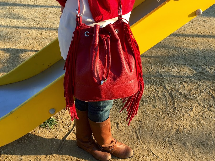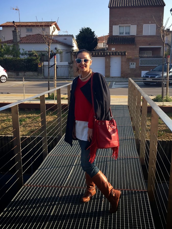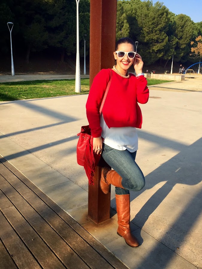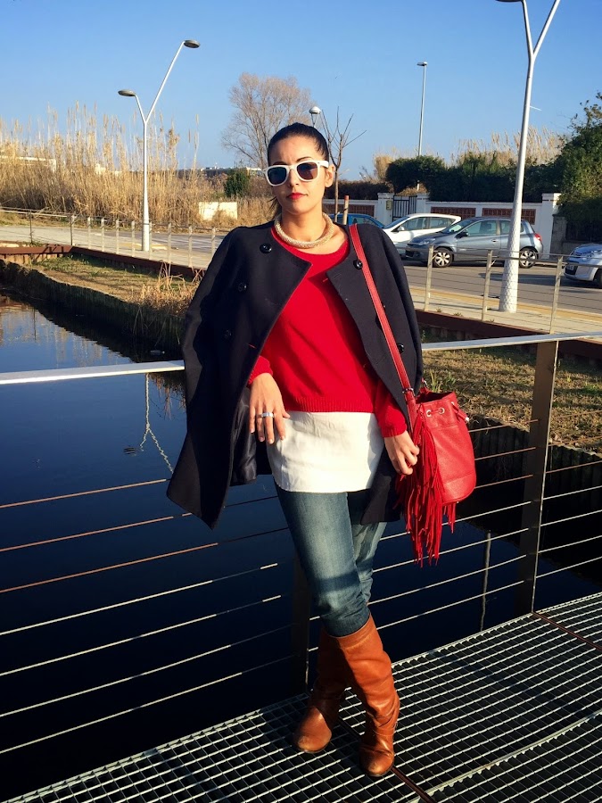 !Buenas noches amores! Después de un fantástico fin de semana, empezamos nueva semana. El look que os muestro hoy es el que lleve el pasado viernes. Un look casual donde la prenda protagonista es mi nuevo jersey rojo de Stradivarius. Lo combiné con jeans, abrigo azul marino, botas marrones y mi nuevo bolso rojo de flecos, del que estoy completamente enamorada y que seguramente vais a ver muchas veces por el blog.