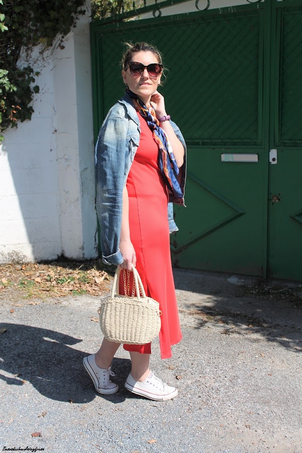 Lo llevo con sneakers para ser un look totalmente sport, pañuelo al cuello, cazadora denim y capazo