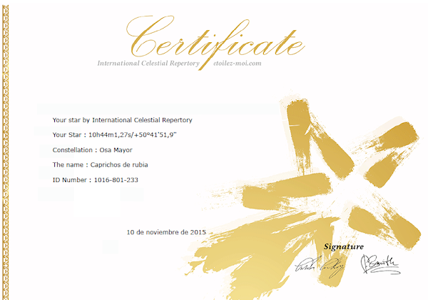 ¿Conocéis Étoilez-moi? Hace unos días se pusieron en contacto conmigo para hacerme una propuesta de colaboración muy interesante y me hicieron un gran regalo: una estrella con el nombre del blog y la fecha en la que se creó!!! Nuestra estrella se llama Caprichos de rubia y está situada a 10h 44m 1,27s / +50º 41´ 51,9" en la Constelación de la Osa Mayor. Ya tenemos nuestro certificado del International Celestial Repertory (Registro americano de referencia en la nomenclatura estelar) que acredita el bautizo de esa estrella con nuestro nombre, el mapa para poder localizarla, la ficha de nuestra constelación para saber más sobre ella y un pequeño poema personalizado, así que ya os podéis imaginar la ilusión que me hace, con lo que me gustan a mí estos detallitos.