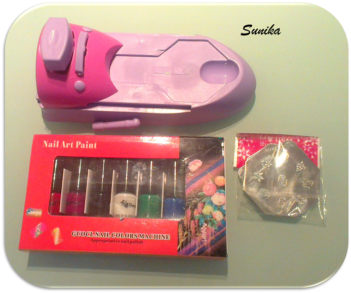 Luego también me llego un kit de Nail Art. Consiste en una maquinita para ayudar a estampar las uñas que viene con los esmaltes para estampar y varias placas con distintos diseños.