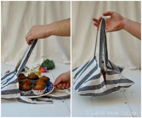 Se trata de una bolsita para transportar repostería, hecha con un trapo de cocina! La idea la he cogido del blog El nido de mamá gallina y podéis ver su post dónde explica cómo hacerlo incluso con un video tutorial, pinchando aquí.
