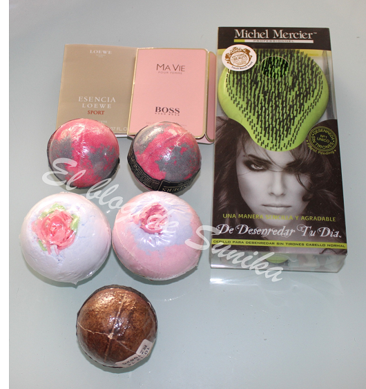 ¿A qué hay de todo? Os lo voy enseñando por partes para que lo veáis bien. En Douglas aprovechando que tenía un 20% de descuento en toda la tienda me hice con el cepillo para el pelo que desenreda fácilmente sin romperlo, tiene 428 cerdas a distintas alturas para dispersar la presión que se aplica al cabello al peinarlo evitando también la caída y pérdida del mismo. Luego como hago siempre que voy a Douglas pillé unas cuantas bombas, una con aroma de rosas, otra de café, otra con aroma a peonias y dos Sex Intento reservarme todas las semanas un ratito para tomarme un baño relajante y me encantan las bombas para el baño. Además me regalaron dos muestrecitas de colonia, Ma Vie de Hugo Boss para mujer y Esencia Sport de Loewe para hombre.