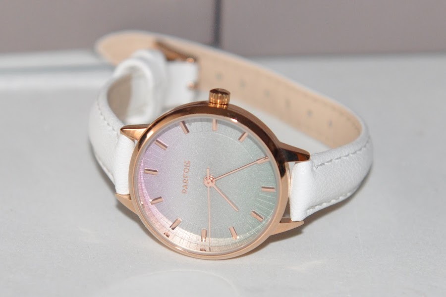 Este elegantísimo reloj con correa imitación a piel blanca,esfera por fuera es dorada y por dentro hace un degradado de rosa a verde es un reloj a pilas y de diseño antiguo.