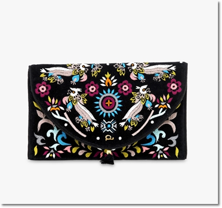 Cartera de rayón con bordados y cierre de solapa. Elegante y ponible en cualquier temporada.