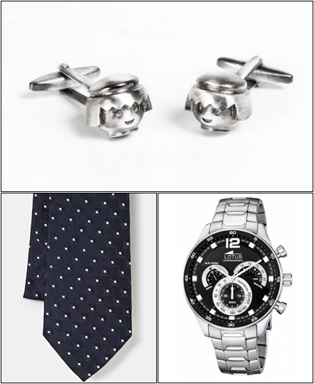 Elegante. Para los chicos elegantes me encanta elegir regalos, por ejemplo estos gemelos inspirados en los clics de Famobil, los puedes encontrar en Soloio por 35,90€. Una corbata de seda de Armani por unos 95 € aprox, y este reloj con cronógrafo de Lotus modelo 10120-3 por 130 €.