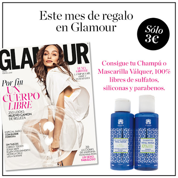 La revista Glamour trae de regalo un champú ó mascarilla de Válquer, 100% libres de sulfatos, siliconas y parabenos. Tengo el champú y tenéis la review en este post de cositas varias.