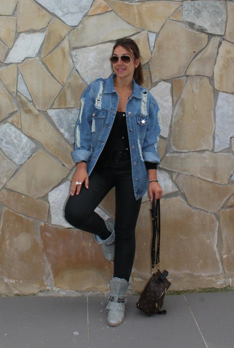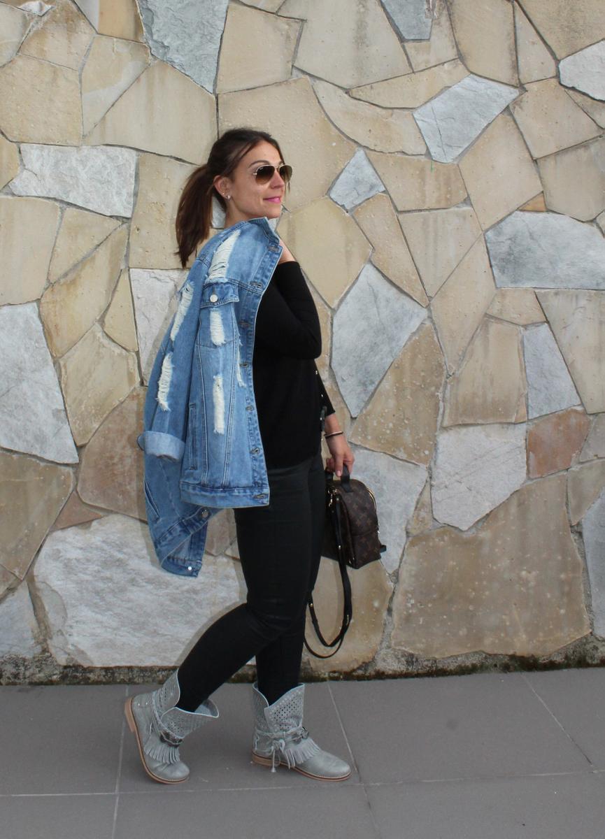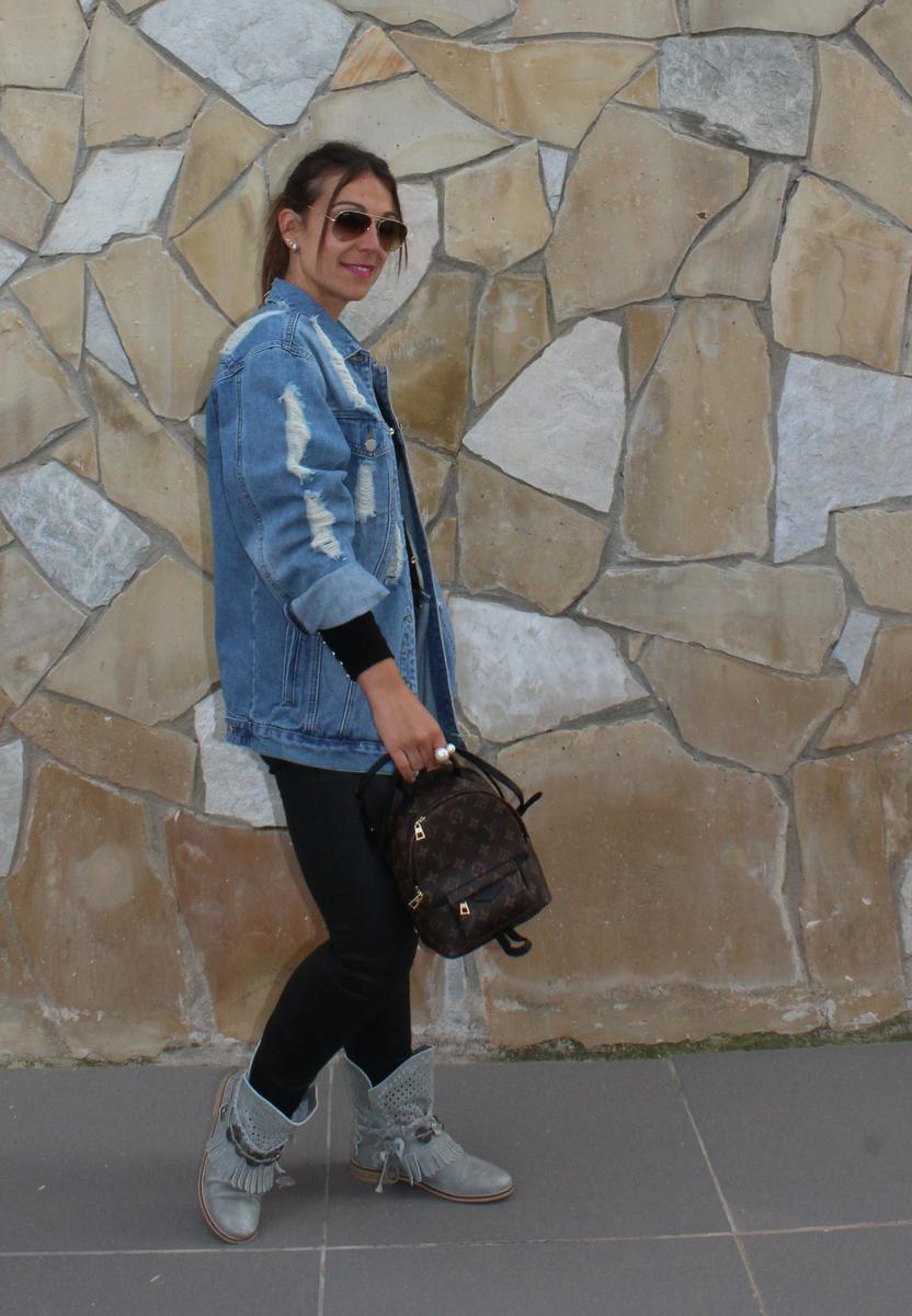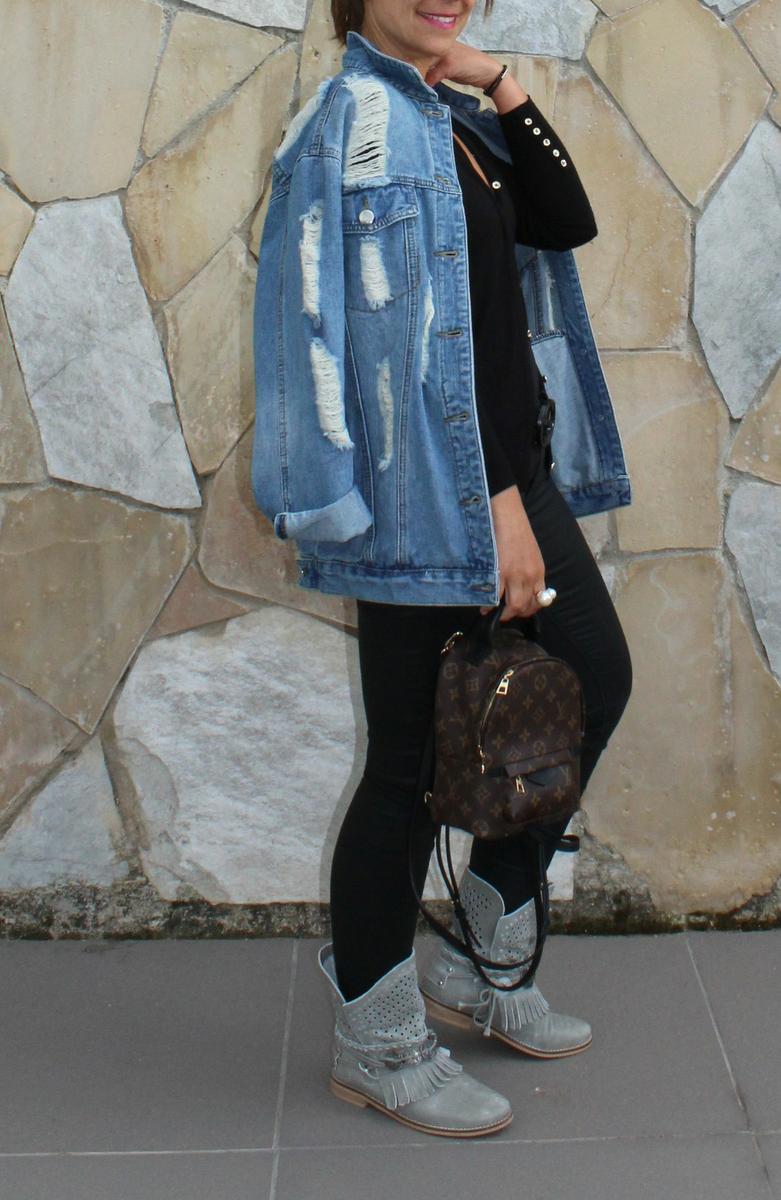 La que yo he elegido es de la marca SHEIN, a parte de grande también combina rotos por todos los lados , adaptada un poco más con el resto de tendencias actuales. El resto del look muy sencillo y muy cómodo, pantalones pitillo negro encerados, con camiseta y chaqueta básicas en negro. En los pies botines a tono con la cazadora, adornados con monedas y flecos, y mochila que esta vez la llevo a modo de bandolera.