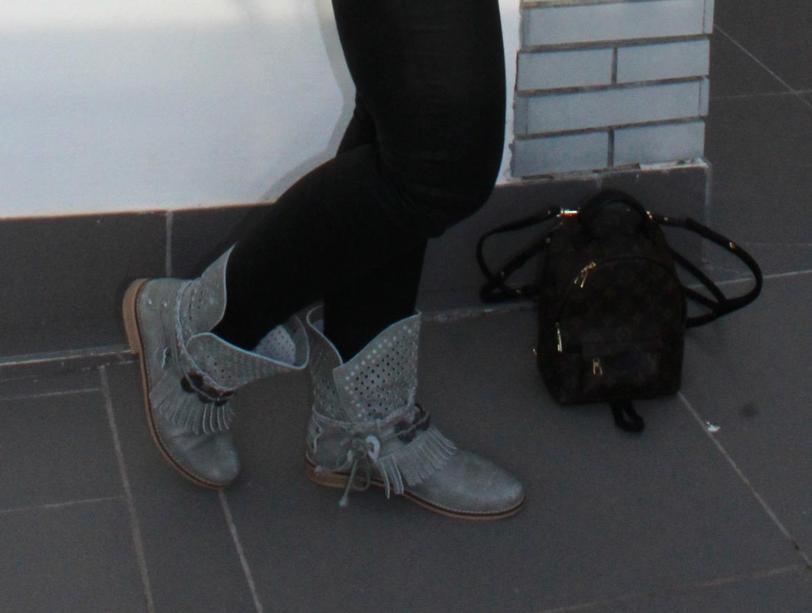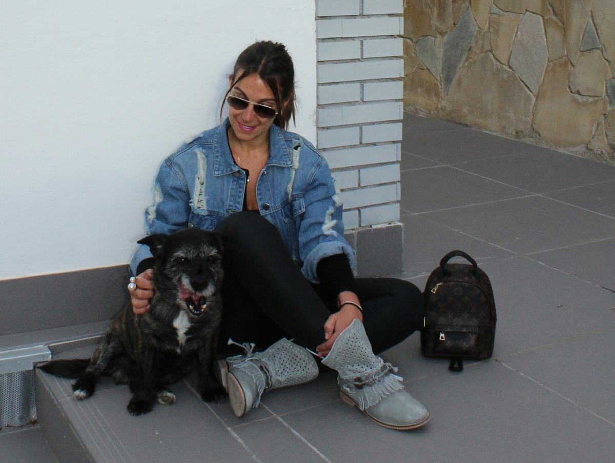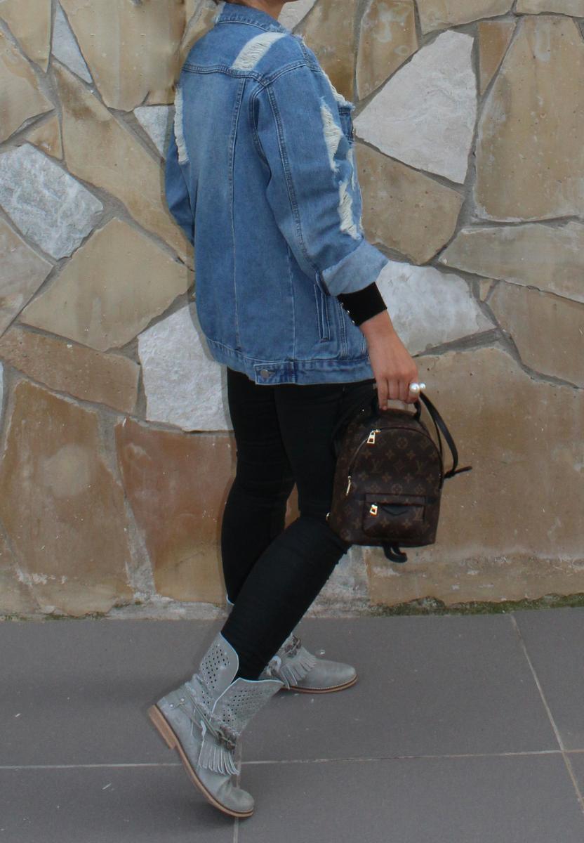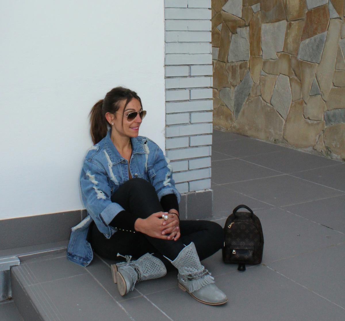 La que yo he elegido es de la marca SHEIN, a parte de grande también combina rotos por todos los lados , adaptada un poco más con el resto de tendencias actuales. El resto del look muy sencillo y muy cómodo, pantalones pitillo negro encerados, con camiseta y chaqueta básicas en negro. En los pies botines a tono con la cazadora, adornados con monedas y flecos, y mochila que esta vez la llevo a modo de bandolera.