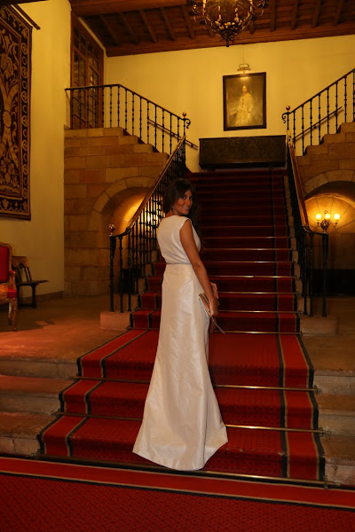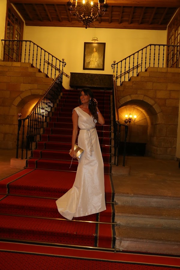 Al final nos decantamos por este vestidazo largo con cola de Nihil Obstat en gris perla de escote y falda cruzada con un cinturón plateado de pasamanería con dos borlas en los extremos que me pareció sencillo y elegante a la vez, pero también súper femenino y muy sofisticado. Y... no sé a vosotras, pero a mí me recordó a los que lucían las grandes estrellas del cine clásico de Hollywood de los años 40 y 50.