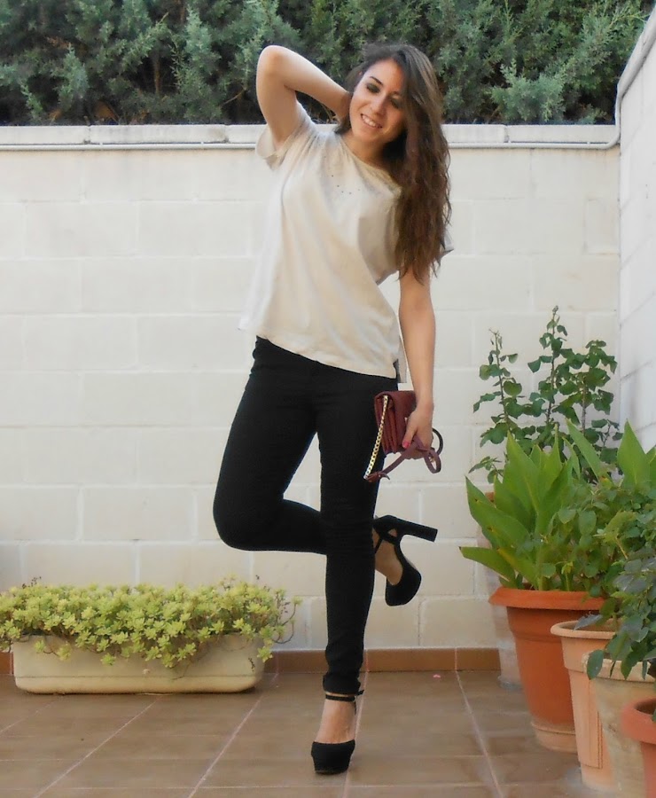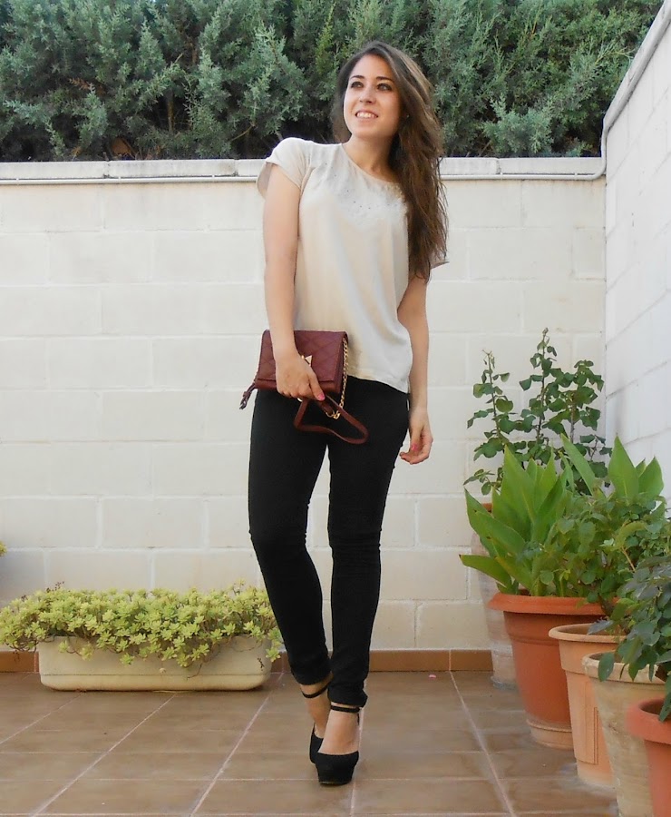 Empezamos la semana con un look totalmente nuevo, el cual es apto para trabajar en la oficina y tomarnos unas copichuelas después, o directamente, para salir a dar un paseo, cenar... ¡Lo que os apetezca! Está compuesto de pantalón pitillo negro, camiseta en color blanco roto o crema, según lo veáis; zapatos en negro - ganga rebajil -, y bolso burgundy para darle ese toque diferente. ¿Qué os parece?