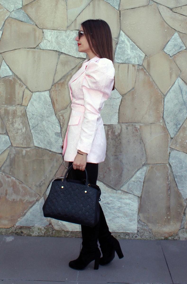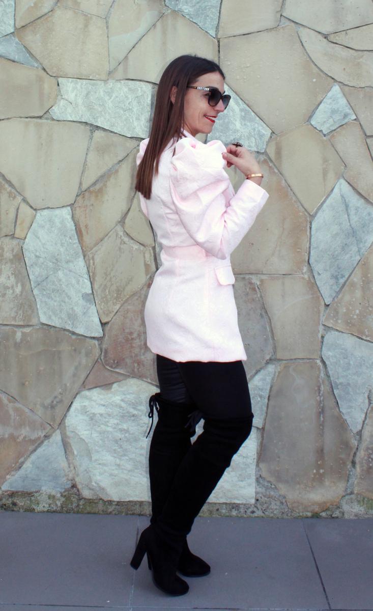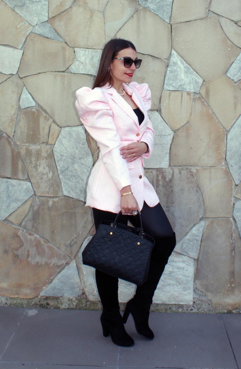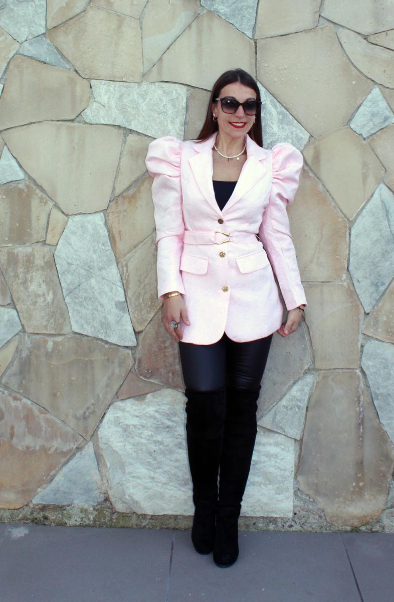 Aquí os he enseñado muchos looks con este tipo de mangas, pero creo que este el que más lleva al extremo la tendencia. Una chaqueta tipo americana en un color rosa bebe y con unas mangas bastante prominentes que contrastan con lo ceñido de la chaqueta, marcando cintura y moldeando el cuerpo a una perfecta silueta de reloj de arena.