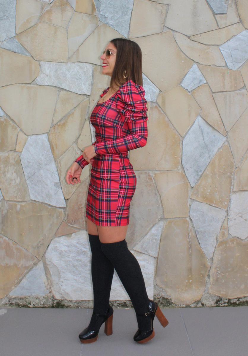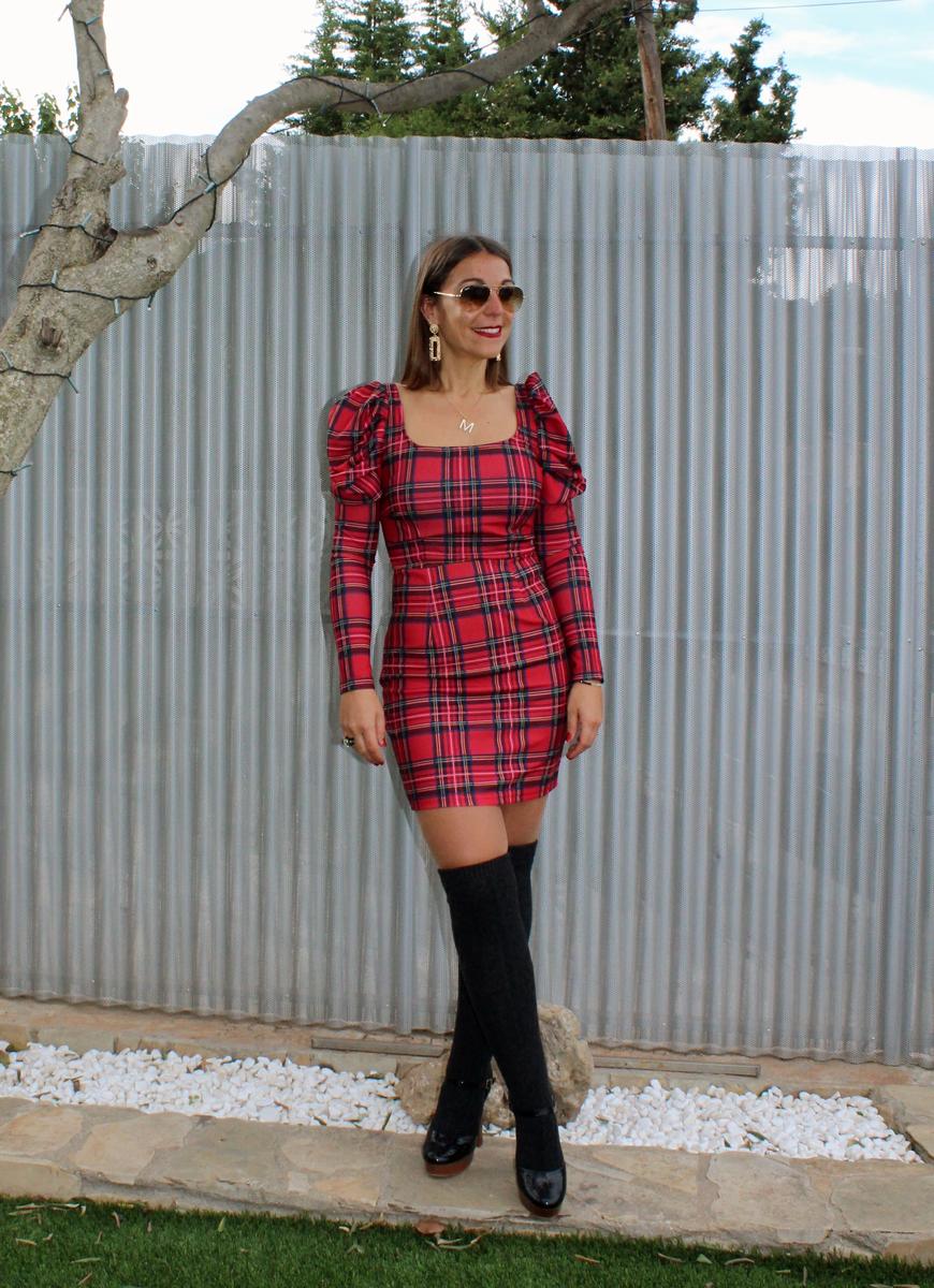 3.-Tartán abullonado: en este caso un vestido ajustado, tanto el cuerpo como las mangas, justo hasta la parte superior (biceps-hombro) en el que aparece el volumen.