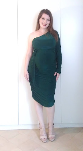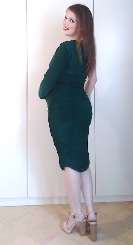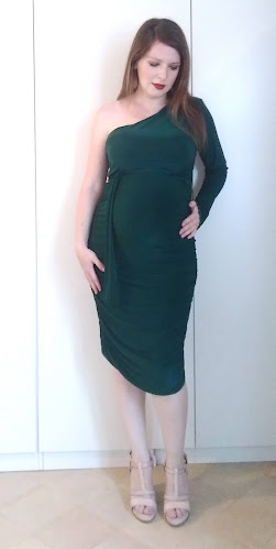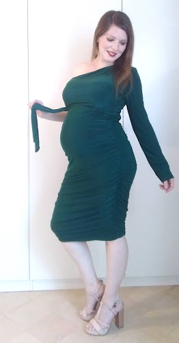 Para el final dejo la prenda más especial y llamativa de Femmeluxe. En esta ocasión, un vestido ceñido y fruncido en verde esmeralda oscuro con una manga larga en el lado izquierdo.