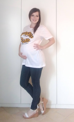 He combinado esta camiseta blanca con un vaquero ajustado (premamá, todo hay que decirlo) y cuñas blancas de pulsera en piel y madera