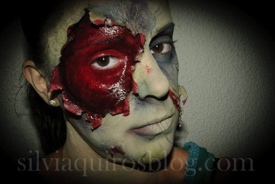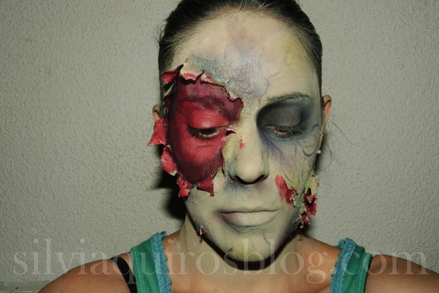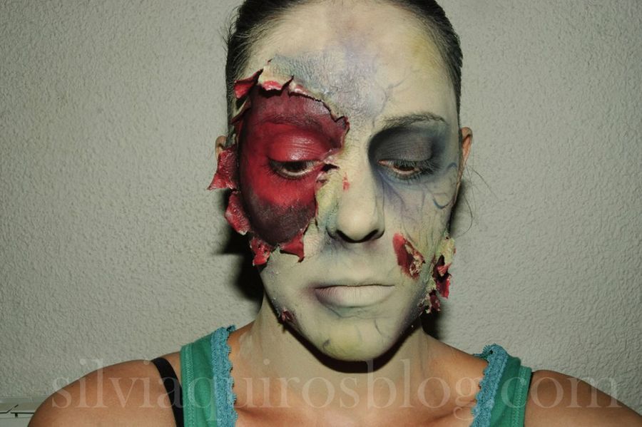 Para crear un efecto de piel podrida, aplicaremos una base de maquillaje lo más clarita posible, mezclada con un tono verde, para el que podremos usar pinturas o cremas infantiles para disfraces. Es importante que evitemos usarlo en el interior de nuestras 'heridas'.Seguidamente, aplicaremos polvos sueltos por todo el rostro y emplearemos tonos verdes oscuros, primero, y morado y negro después, en diferentes zonas. Éste último lo usaremos para la zona interna del lagrimal, mientras que el morado también será aplicado alrededor de las heridas.