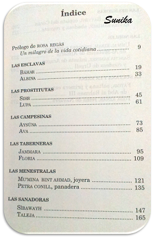 Ahora os comento mi opinión, es un trabajo de investigación impresionante, toda la información está reflejada de forma novelada lo que hace muy fácil su lectura, te engancha, te atrae y saboreas cada página. Yo tengo un ejemplar de la 6º edición que compré ya ni me acuerdo y que os puede mostrar que el libro ha tenido mucho tirón. Viene estructurado de una manera muy clara comparando la vida de ambos tipos de mujeres las moras y las cristianas siendo esclavas, prostitutas, campesinas.... terminando con la sultana y la reina. En cada caso escogen una mujer mora y otra cristiana y nos cuentan su historia, como por ejemplo en las esclavas nos hablan de Báhar la mora y Albina la cristiana o en las reinas con Fátima, sultana y primera esposa de Abd al Rahman III y Toda Aznar, reina de Navarra.