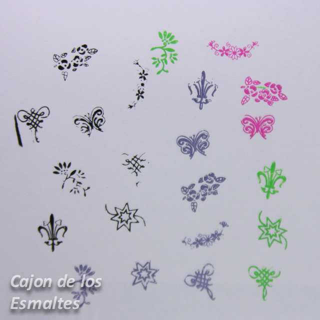 Probé cada uno de los diseños sobre papel con el sello original de Konad sin mayores problemas como pueden ver abajo con un esmalte negro de Kleancolor, un metálico de Kiko y pasteles de Mundo de Uñas. Las líneas más finas de los diseños se desdibujaron en algunas de las pruebas con el negro así que el resultado va a depender bastante del esmalte que usen.