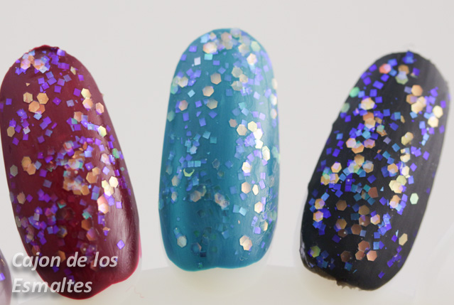 Macro time! Heavenly como buen topper es muy versátil, la base amarillenta no opaca "casi" el color de base aunque hay que tener cuidado de cubrir toda la uña para evitar que quede algún lugar con color desparejo. Con una capa generosa logran una distribución más que suficiente en la uña. Me gasté medio uñero en probarlo con distintos colores y la verdad que se puede usar casi con cualquier color abajo, con los oscuros van a lograr el efecto más dramático obviamente. Y lo mejor es que al ser más bien escamas finas y no glitter "duro" sale muy fácil con quitaesmalte, nada de la lucha que tenemos asociada con el glitter tradicional.