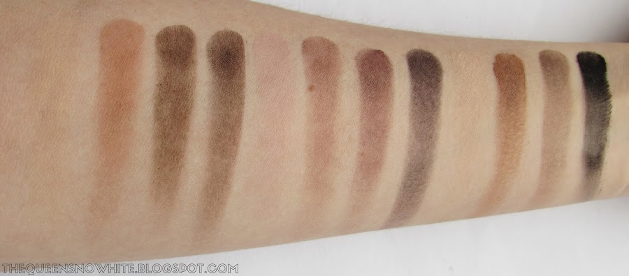 Otra cosa que me decepcionó fue que cuando vi la paleta pensé que obtendría tonos violáceos en los párpados, pero si ven los swatches podrán notar que son más marrones con subtonos violetas que lo que parece en el pan.