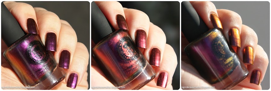Para quienes llegaron aquí sin conocer demasiado del tema, los esmaltes duocromáticos, o multicromáticos son colores metalizados que cambian según el ángulo de la luz. Si no me falla la historia el primer duocromático famoso que dio nacimiento a una generación de clones es el dorado/verdoso Peridot de Chanel. Personalmente no me llama la atención esa combinación pero gracias a él prácticamente todas las marcas han sacado su versión en estos y otros tonos. El efecto de cambio de color en la mayoría de los casos no es muy dramático y se necesita aplicar una base de color negro para que sea apreciable. Esto está empezando a cambiar y la marca indie ILNP con esta colección es un claro ejemplo.