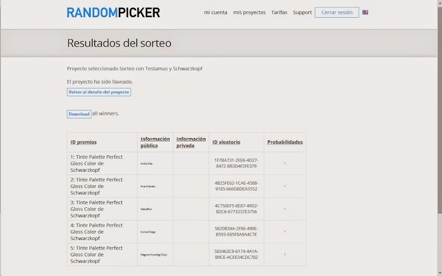 Una vez finalizado el plazo para apuntarse al sorteo, doy paso a la resolución del sorteo. He usado RandomPicker para sacar la lista de 5 ganadoras. Os enviaré un correo a cada una para informaros, igual os sale en la carpeta de spam. Una vez recibido el correo tenéis 24 horas para responderme, después os mandaré el código que tenéis que introducir en la página de Testamus para que os envíen el regalo y paséis a ser pro-tester del producto. Cualquier duda me envías un correo y os explico todo paso a paso.