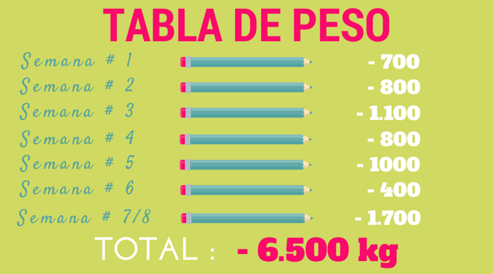 El Lunes de la semana 8 me sorprendí al ver que había perdido correctamente (mejor tarde que nunca)el peso de 2 semanas juntas o sea 1,700 kg. que dividido es dos es como si hubiera perdido 850 gramos cada semana (aunque la báscula no me lo dijera en la primera por causas desconocidas je je ),seguro que te ha pasado o te puede pasar, que alguna semana incluso haciendo bien tu trabajo no veas los resultados esperados pero si sigues tu rutina alimentaría como lo he hecho yo, verás los resultados. Ánimo y sigue así !!!