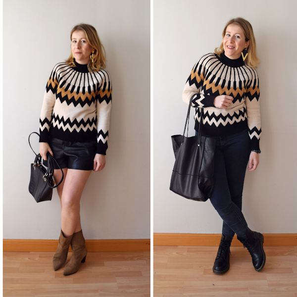 Look 10. Jersey multicolor + leggings negros + botines marrones