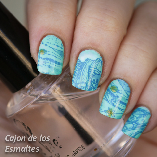 Como por casa el favorito es el turquesa rápidamente terminé en un nail art marítimo, con énfasis en MAR. Y esta vez me animé además del estampado a usar los pinceles y darle un poco de espuma a la ola y color a las estrellas de mar. No es un gran woooow para la técnica de pincel pero bueno, un paso a la vez.