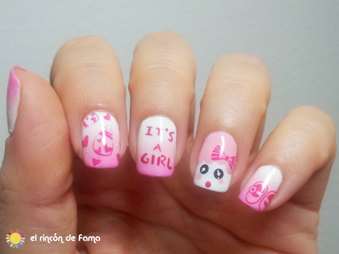 ? Para estampar: rosa oscuro de Guylond. Para letras y detalles: acrílicas? Top coat: poshéPara su concurso Mivi nos pedía que nos inspirásemos en una de sus manicuras y la recreásemos, la verdad es que es una idea fantástica y no descarto hacerlo pronto... ahí lo dejo... Yo elegí ESTA MANICURA porque me parecía muy dulce y además a mi alrededor últimamente se multiplican los embarazos!! jejeje. Yo decidí en lugar de hacer francesa hacer un degradado, que ya sabéis que me chiflan (podéis ver otros degradados AQUÍ, AQUÍ o AQUÍ) y estamparle algunos diseños relacionados con bebés, en el anular, igual que Mivi, hice un pequeño bebé rosado y regordete, jejeje