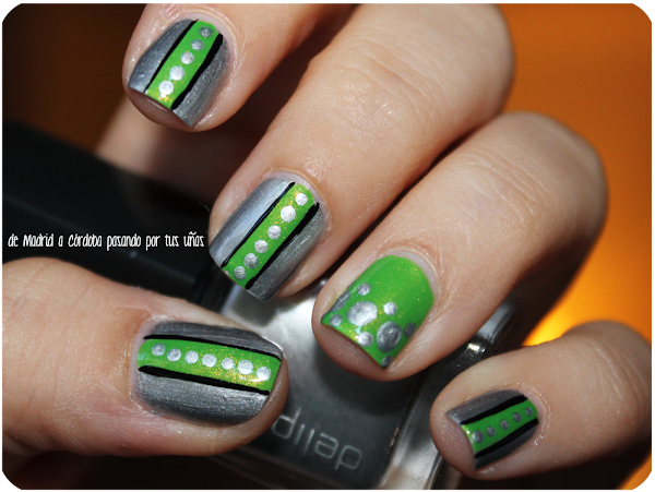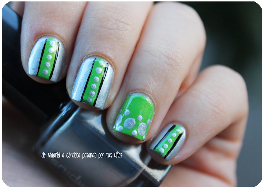 Básicamente lo que hice fue pintar todas las uñas en plateado marcando una en verde, donde hice unos puntos de distintos tamaños con un dotting tool. En las demás uñas, con el mismo pincel del esmalte, hice la raya y después la remarqué en negro a los dos lados con un pincel fino y largo (el de Essence). Para que se viese más el plateado (ya que es el gris el dominante de la manicura), hice otra vez unos puntitos con el dotting tool.