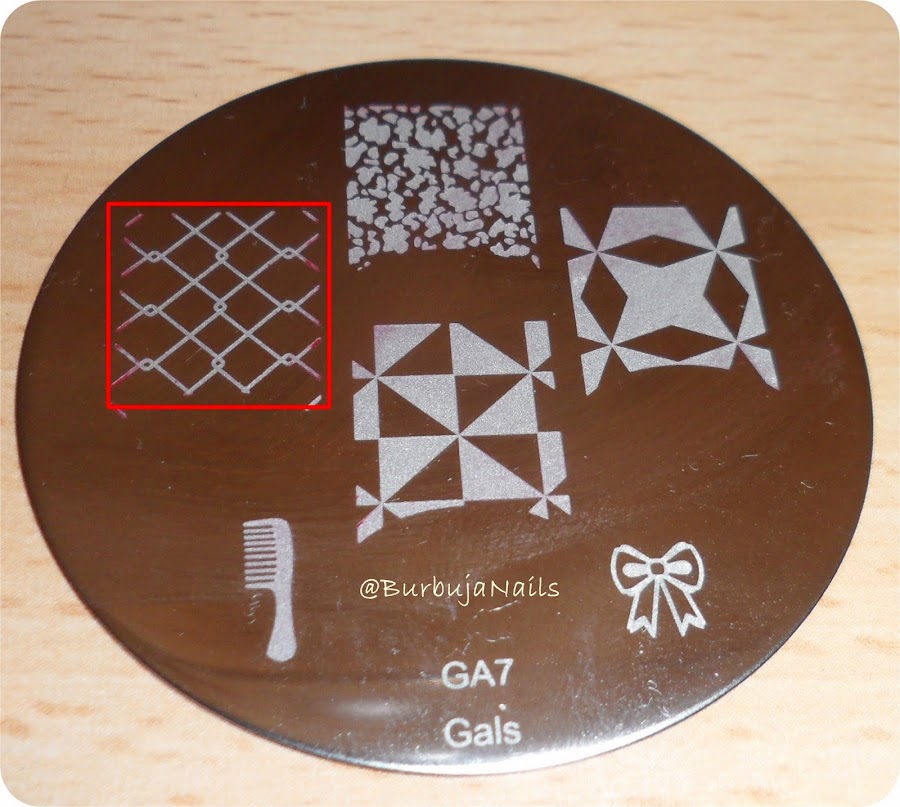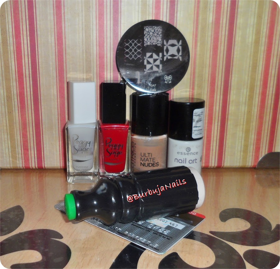3. Cuando han secado en las uñas que he pintado de nude estampo en rojo el diseño que está marcado en la placa.