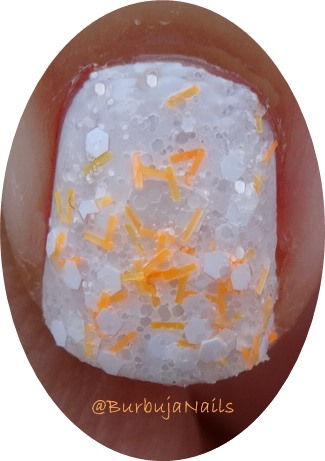 5. Con ayuda de una esponjilla ponemos el glitter sobre el esmalte blanco, también se puede hacer directamente con el pincel pero a mi me gusta más como queda con la esponjilla porque se pierde menos glitter y queda más repartido por toda la uña.