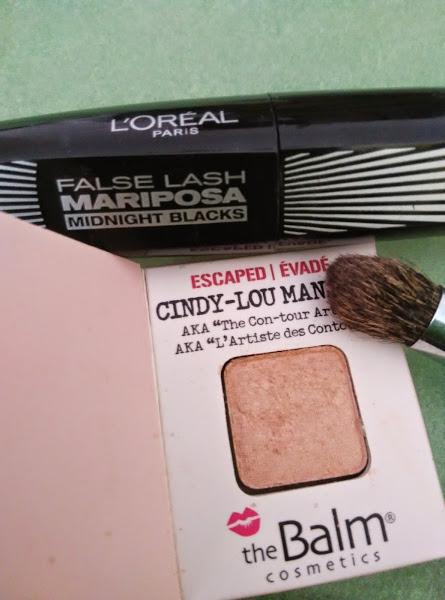 A continuación aplicamos sombra beig o vainilla, en mi caso el iluminador de the balm(porque no lo uso y así lo gasto), en el hueso de la ceja para darle más luz a la zona. Y la máscara de pestañas.