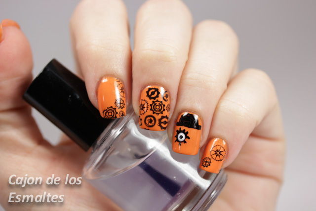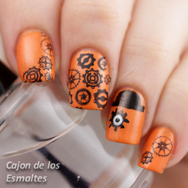 La verdad que es todo un alivio volver al estampado como base para la decoración, debo decir que es mi "comfort zone" y soy feliz ahí adentro. Como concesión les dejo la uña del anular donde dibujé con fibra el sombrero y use las herramientas de dotting o punteros para dibujar el ojo. La placa es la 415 del set CYO de Bundle Monster. Y sí, cualquier día de estos tengo pendiente una mani con esos 0"s y 1"s.