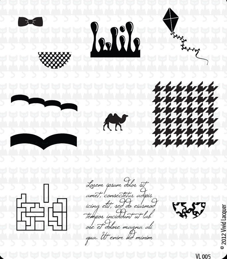 La placa que usé para estampar el diseño es la VL005 de Vivid Lacquer. Fue una de mis primeras compras de placas hace un par de años y motivada tanto por el diseño de pata de gallo como por el del texto escrito. En aquel momento no había demasiadas opciones, hoy en día si les gusta el diseño además de una placa de Moyou London enteramente dedicada al tema tienen una opción china con 3 diseños similares y muy económica en BornPretty.