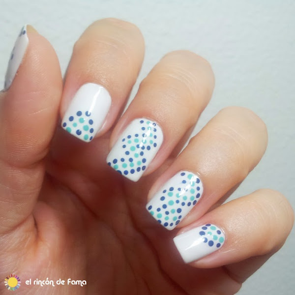 ? Para la base: White on White de China Glaze (dos capas finas) ? Para los puntos: For Audrey y Firts Mate de China Glaze? Top coat: poshéMás sencillo imposible... DOTS DOTS DOTS!!!!! jejejeje. Como recomendación os diré que empecéis trazando el zig zag del centro y después a cada lado le ponéis otra línea de puntos, buscad los colores que más os gusten y listo!!