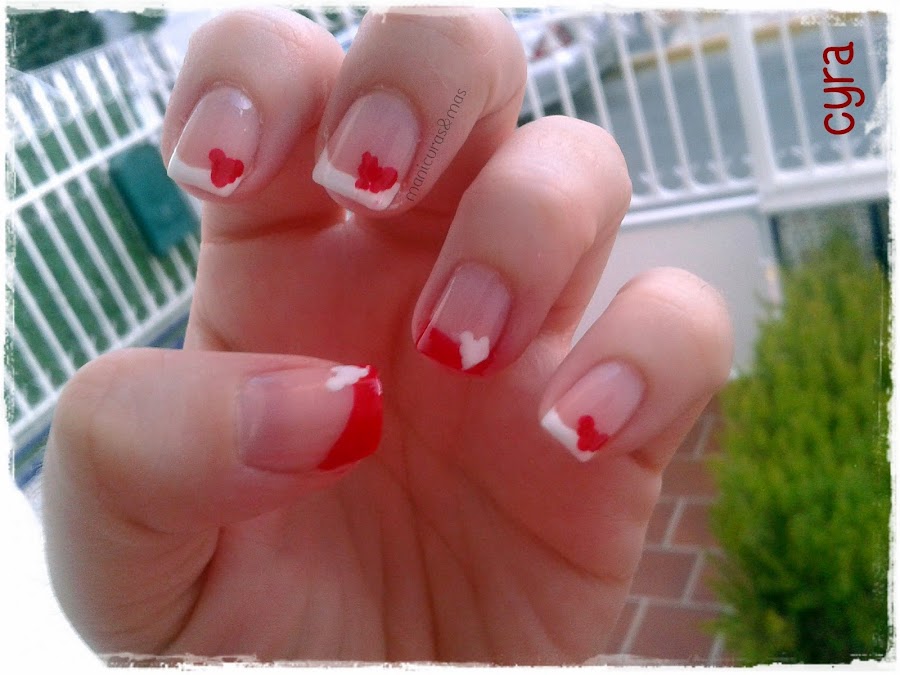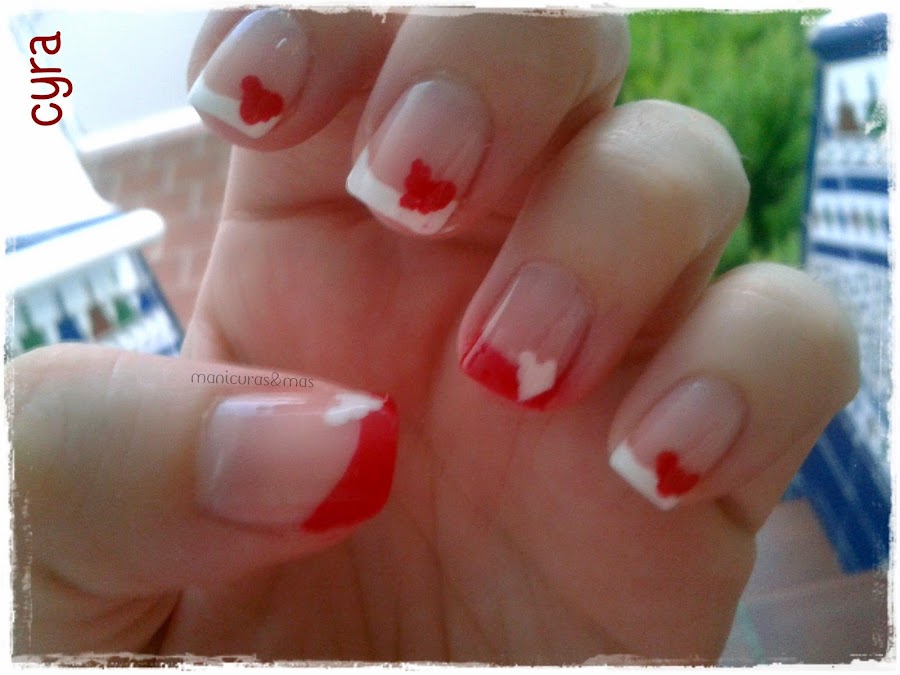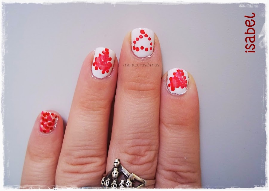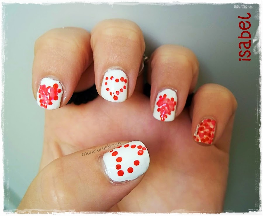 Mi compañera Isabel ha utilizado un esmalte blanco de base para dibujar corazones con puntos en color rojo encima. Algunos de estos corazones van rellenos de más puntos y en otros ha dejado sólo su contorno para que se aprecie bien