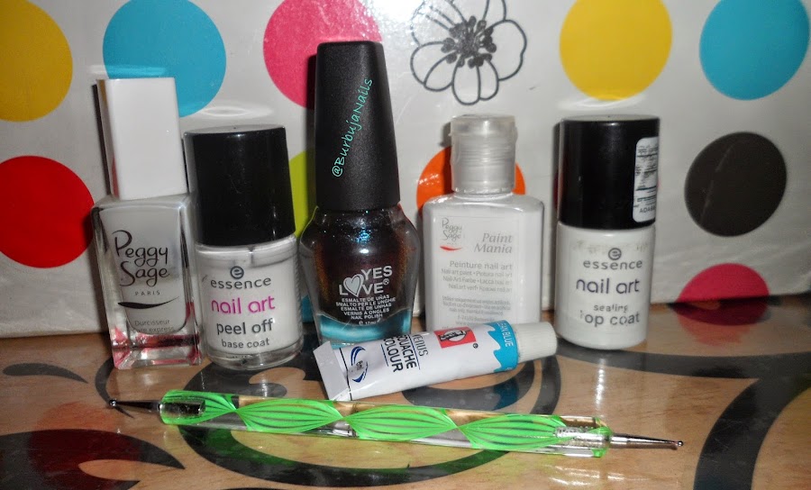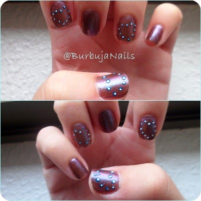4. En tres uñas dibujamos la forma de un corazón con puntitos azulados.