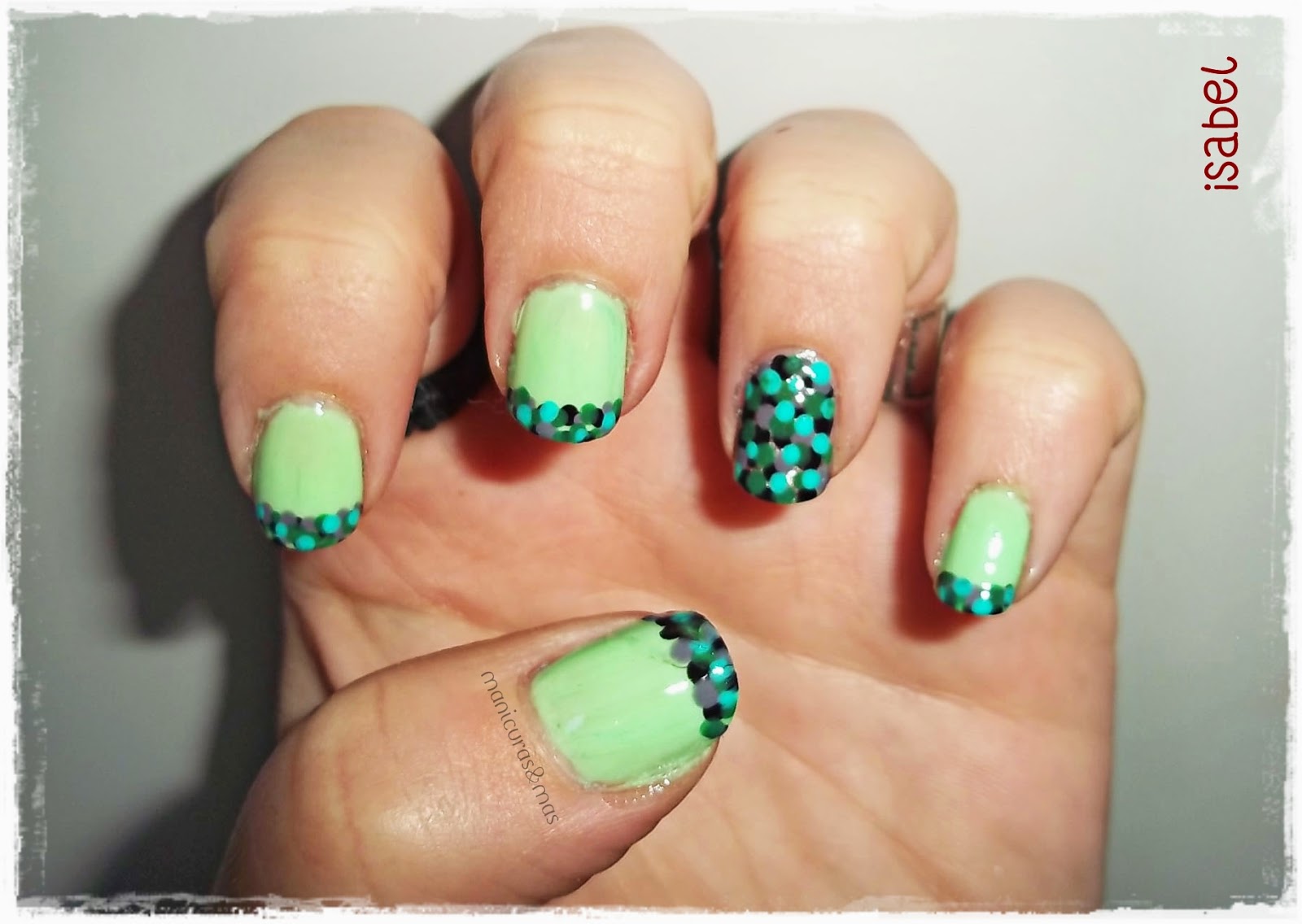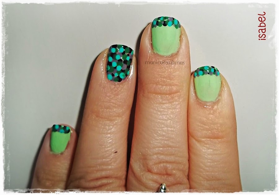 Esta semana Isabel ha realizado una manicura en tonos verdes, haciendo una francesa de puntos sobre una base en verde clarito. En el dedo anular ha cubierto toda la superficie de la uña con los mismos tonos de esmaltes con los que ha hecho la francesa en el resto de dedos.