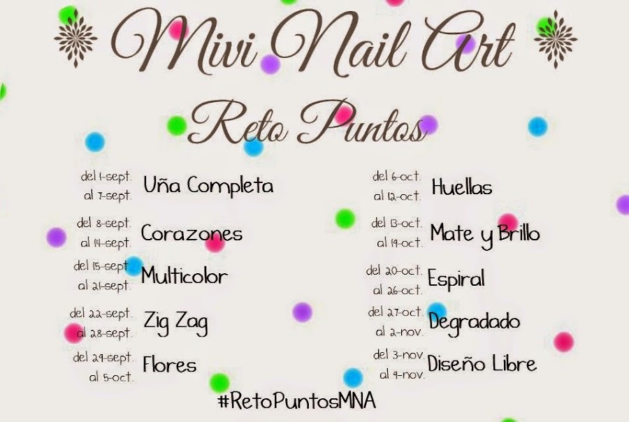 ¡Última semana del Reto de Puntos! ¡Qué rápido se nos ha pasado! Queremos agradecer a María del blog Mivi Nail Art por organizarlo, ya que gracias a este reto hemos tenido oportunidad de probar nuevos diseños y de conocer a nuevas compañeras del nail art.