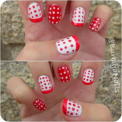 4. En las uñas pintadas de blanco hacemos una francesa roja y puntos rojos el resto de la uña.