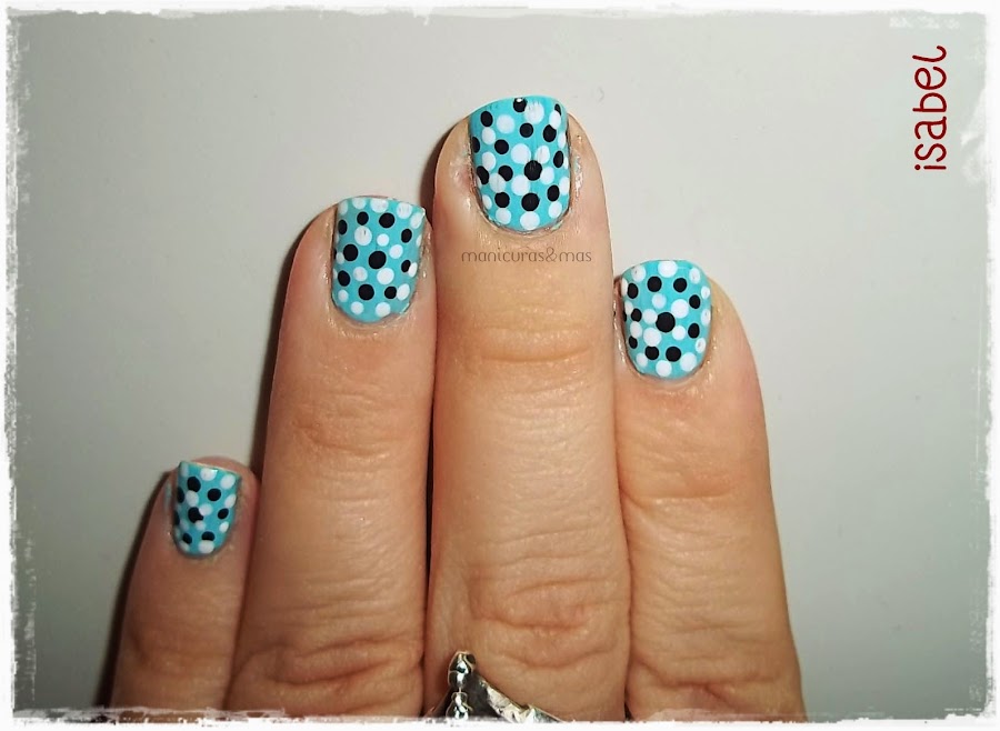 Sobre una base celeste, Isabel ha realizado un diseño de espiral en toda la superficie de la uña utilizando esmaltes en blanco y negro.