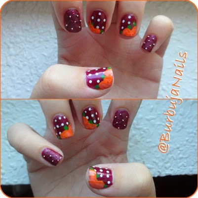 6. Hacemos unas rosas, para eso primero hacemos la forma redondeada con el esmalte naranja clarito y con el oscuro le hacemos el contorno y algún semicirculo por dentro.