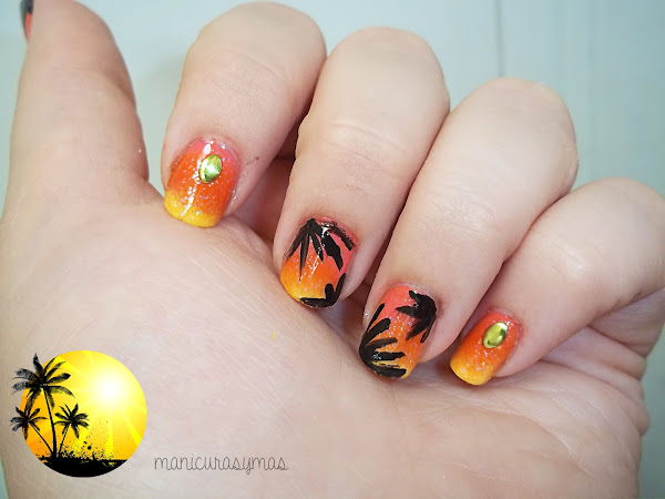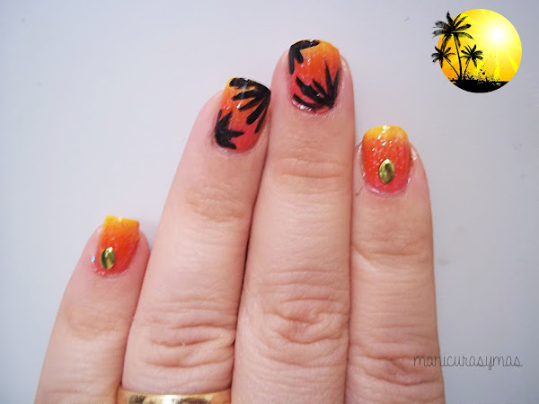 Cuando leí el tema Hawaiana lo primero que me vino a la mente fue hacer flores, pero ya tengo alguna manicura de flores y no quería repetir. Así que mi compi de blog Cyra me dio una idea con estos colores para hacer un degradado y le puse un shimmer blanquecino que hace tonos dependiendo de como le de la luz. En dos uñas hice como si fueran hojas de palmera y en las otras uñas me decidí a poner estas tachuelas doradas en forma ovalada.