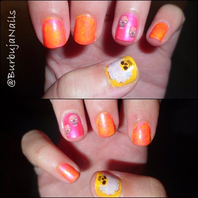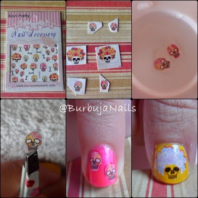 - La ponemos sobre la uña y deslizamos un poquito de manera que el dibujo sale del papel y con ayuda de la pinza de depilar cogemos el dibujo y lo ponemos en la uña (de esto me di cuenta luego como veis en las uñas gorditas no se ven los colores de las flores)