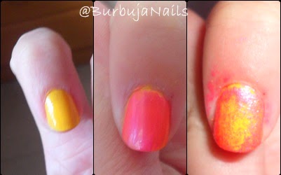 5. Hacemos una bolita con el film y damos ligeros toques sobre el esmalte rosa de manera que van apareciendo huecos amarillos.