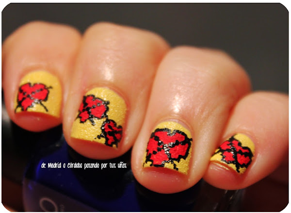 Bueno, como veis, el esmalte de base es el que os he dicho al principio, el Downtown de Rare Nails. Ahí lleva dos capas, ya que con una se quedan huequecitos y no queda bien del todo. Los corazones están pintados con pintura acrílica y no lleva top coat. Me daba miedo que el efecto arena se perdiese (¿sabéis si eso es así o es solo una impresión mía?), así que ahora mismo el amarillo está intacto pero los corazones están medio borrados al haber estado con agua.