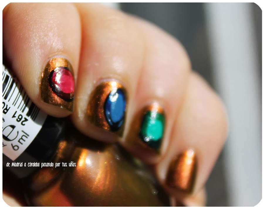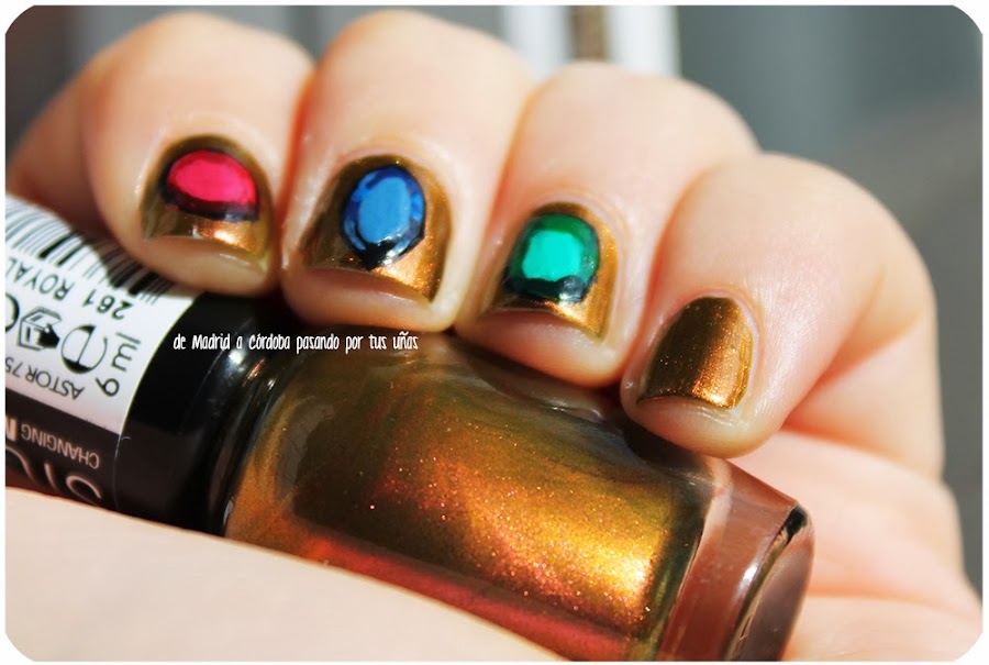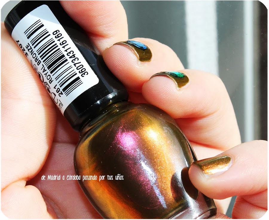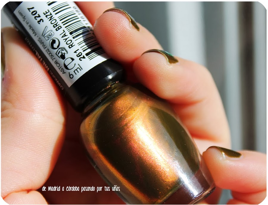 Seguimos con el Reto de los tipos de esmaltes y esta semana toca usar esmaltes duocromos o multicromos. Yo solo tengo duocromo (gracias a mi suegri jiji), y es el 261 de Astor "Royal Bronze" de la colección "Fashion Studio Modern Baroque Collection".