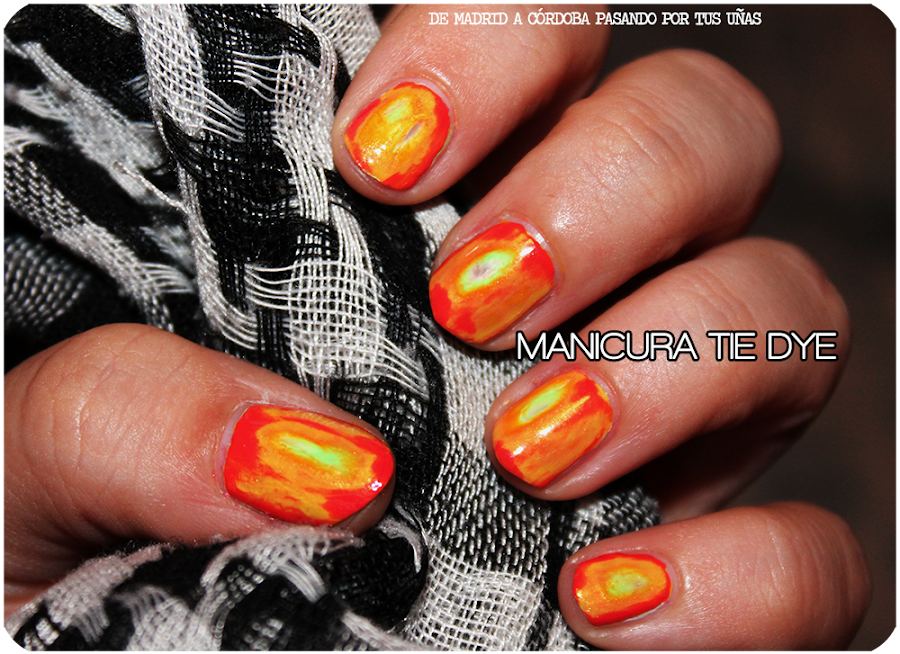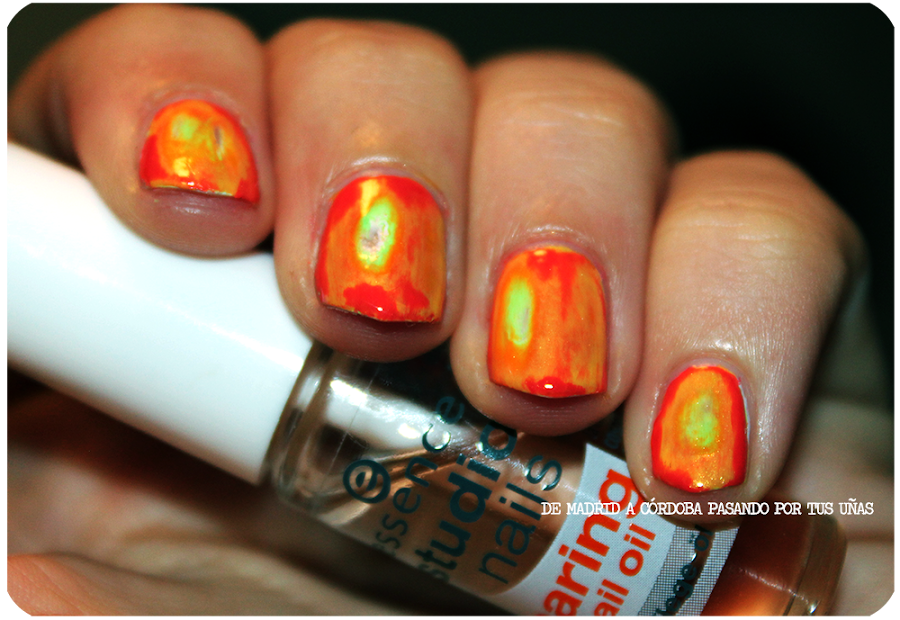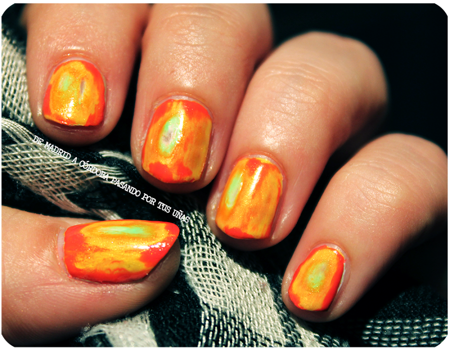 Pues dándole simplemente una capa de cada esmalte, dejando secar y frotando con un bastoncillo mojado en quitaesmaltes conseguimos esta manicura. Y podemos probar con un montón de colores. Yo he elegido estos porque son los únicos colores neón que tengo.